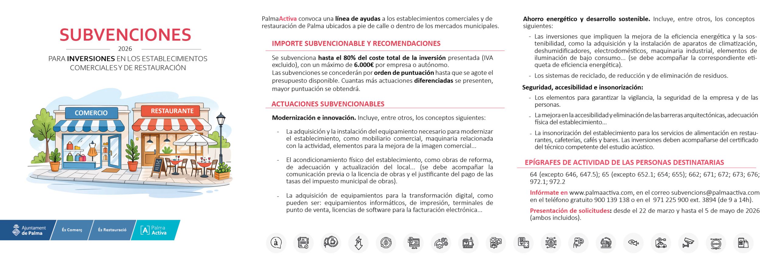 Pueden ser beneficiarios de las ayudas las personas físicas y personas jurídicas sometidas a derecho privado, las agrupaciones de éstas y también las comunidades de bienes y otras figuras colectivas civiles, unidades económicas y patrimonios separados que desarrollen una actividad comercial y/o de restauración en el municipio de Palma que estén situados a pie de calle o dentro de un mercado municipal.